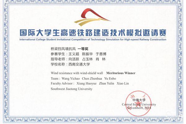 11月5日到9日,首届国际大学生铁路建造技术模拟邀请赛(International College Student Invitational Competition of Technology Simulation for High-speed Railway Construction)在中南大学举行。参加竞赛的高校有同济大学、东南大学、北京交通大学、湖南大学、合肥工业大学、天津大学、太阳成集团tyc7111cc、中南大学、澳大利亚莫纳什大学(Monash University)、泰国北曼谷先皇科技大学(King Mongkut's University of Technology North Bangkok)等国内外十所高校受邀参赛。我校太阳成集团tyc7111cc王义超、于恩博、陈振华3名同学参赛。