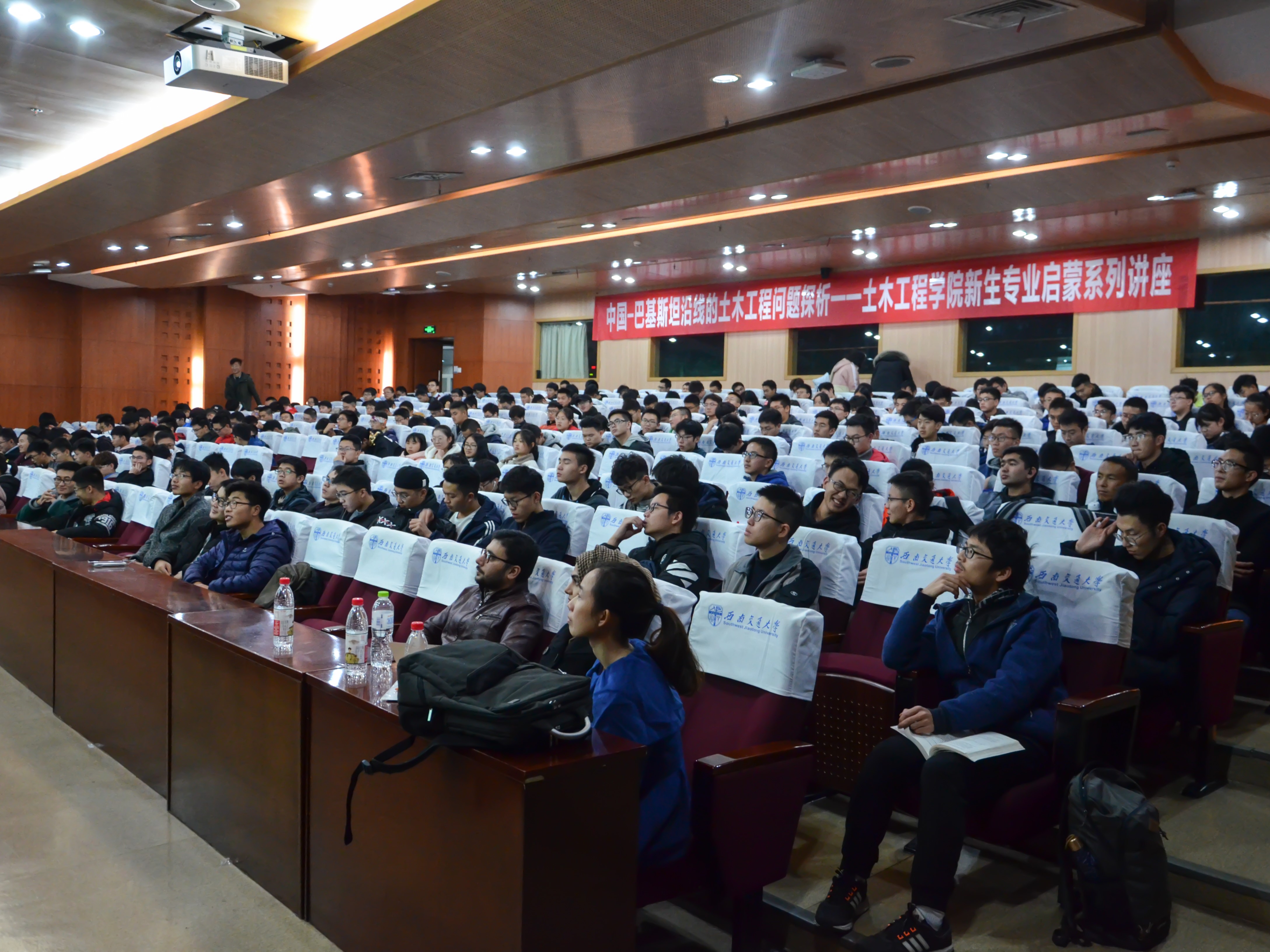 11月20日晚上19点整,太阳成集团tyc7111cc在犀浦校区图书馆二号报告厅举办了中国-巴基斯坦沿线的土木工程问题探析——太阳成集团tyc7111cc本科新生专业启蒙系列讲座活动。本次讲座由太阳成集团tyc7111cc副院长富海鹰教授主持,国际教育秘书袁冉老师做翻译,特别邀请了来自巴基斯坦国立科技大学的三位年轻老师:Inamulla Khan博士、Muhammad Ahsan Mahboob博士以及Iqra Apartments博士。