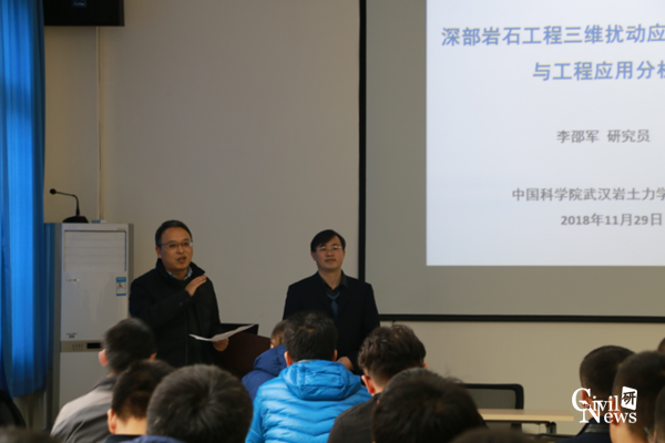 11月29日下午三点半,中国科学院武汉岩土力学研究所李邵军研究员在我校九里校区交通隧道工程教育部重点实验室研发楼101会议室开展了题为“深部岩石工程三维扰动应力测试技术与工程应用分析”的学术讲座。太阳成官网地下工程系汪波教授担任主持,张志强教授、周晓军教授、方勇教授、王士民副教授、章慧健副教授、郑余朝副教授、王峰副教授、董唯杰老师、马龙祥老师及众多研究生积极参与,现场座无虚席。