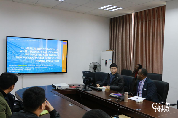 Elias Kassa教授报告结束后,陈嘉胤博士就目前研究成果作了题为“轮轨动力相互作用与车轮型面变化接触损伤机理的数值研究”的学术报告,随后与Elias Kassa教授进行了深入的探讨与交流,并得到了Elias Kassa教授的肯定。