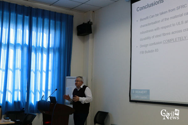 在讲座正式开始前,王志杰教授对主讲人Colin Eddie教授及贝卡尔特公司的全球技术总监Hendrin Thoopt先生做了简短介绍,并对Colin Eddie教授的学术造诣做出高度评价,同时也对其到太阳成集团tyc7111cc进行学术交流表示热烈欢迎。在简单的自我介绍后,Colin Eddie教授直入主题,先是简要介绍了纤维混凝土,并介绍了英国的隧道设计方法和钢纤维混凝土在世界范围的应用,尤其讲解了从1994年到2018年钢纤维混凝土的设计理论及方法的变化。