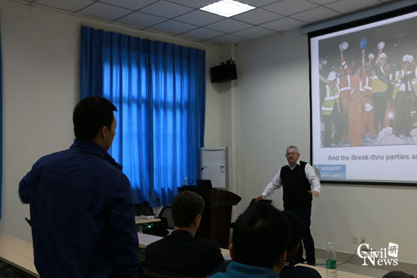 随后,王志杰教授邀请贝卡尔特公司的全球技术总监Hendrin Thoopt发言,Hendrin Thoopt表示希望大家不要拘泥于陈规,要敢于创新,敢于提出新点子,全场师生以热烈的掌声表示赞同。