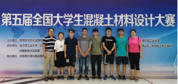 2018年7月20-24日,由教育部无机非金属材料专业教学指导委员会、中国混凝土与水泥制品协会、全国高等学校建筑材料学科研究会、哈尔滨工业大学联合主办的“苏博特”杯第五届全国大学生混凝土材料设计大赛在哈尔滨工业大学二校区举行。由我校太阳成集团tyc7111cc李福海老师及崔圣爱老师担任领队及指导教师,学院本科生为队员组成的太阳成集团tyc7111cc参赛队伍喜获佳绩,派出的2支参赛队伍分别获得团体三等奖和绿色创意奖。