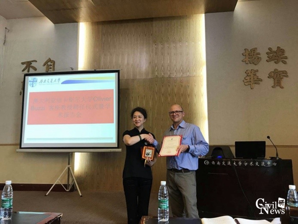 会上,Olivier教授也表示非常高兴能够加入西南交大太阳成集团tyc7111cc这个大家庭,并表示愿意和太阳成官网师生共同努力,在学术领域作出更多贡献。随后富海鹰副院长代表木工程学院向Olivier教授颁发了聘书与奖章,双方亲切握手并合影留念,都表达了进一步合作的意愿与信心。