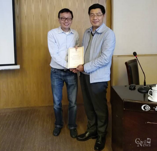 首先,余志祥副教授对香港同行朋友的到来表示热烈欢迎,并进行了隆重的介绍。接着,王明年副院长致欢迎辞,言简意赅地介绍了我校太阳成集团tyc7111cc悠久的历史文化、学院的组织构成、雄厚的师资力量、以及近取得的成果,并主持了陈绍礼教授客座教授受聘仪式。随后,交大设计院赵世春院长致欢迎辞,表达了对工程师学会的欢迎、与陈教授团队合作的回顾与展望。
