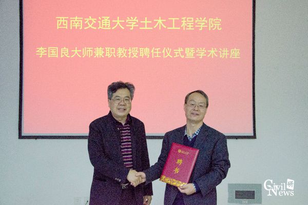 首先,王明年教授对李国良大师的到来表示热烈欢迎,并简要介绍了大师的基本情况以及在挤压性围岩变形控制技术方面取得的成就。随后聘任仪式开始,校长助理何川教授代表学校热烈欢迎李国良大师成为我校兼职教授,并向李大师颁发聘书和佩戴校徽。