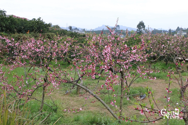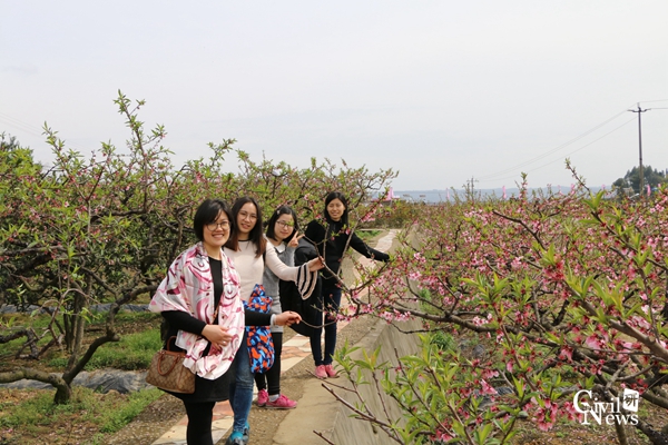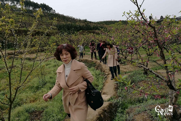 合影结束后,各位老师开始徒步环山赏桃花。只见桃花挨挨挤挤地开满了花趟儿,每一朵桃花都像搽过胭脂似的,桃花千姿百态,让人看了眼花缭乱。有的才展开一片两片花瓣儿,羞答答的,像一个个害羞的小姑娘;有的展开了五片小巧玲珑的花瓣儿,一丝丝红色的花蕊顶着嫩黄色的花粉;有的还只是花骨朵儿,静静地沉睡着,但是看起来饱胀得马上要破裂似的。