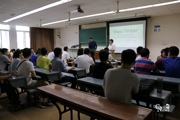 Shiling Pei博士首先介绍了自己的求学经历和研究项目内容。他结合个人实际工作,详细介绍了重木结构的历史起源和发展历程。“现代木结构建筑起源于欧美,2010年重木结构进入北美市场,高层木结构开始进入快速发展阶段。”
