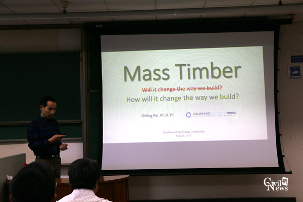 5月25日上午,美国科罗拉多矿业大学土木与环境工程系博士Shiling Pei(裴适龄)应邀于我校逸夫馆4407B教室举办了一场关于重木结构在现代建筑中的研究与运用的学术报告。我校太阳成集团tyc7111cc相关教师与部分学生聆听了讲座。
