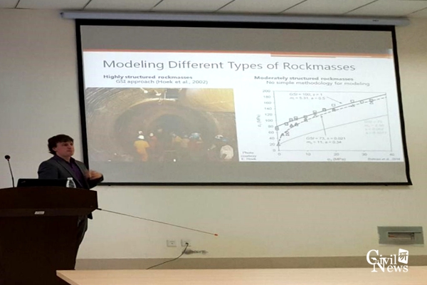 此次报告的主要内容分为两部分。GABRIEL WALTON博士首先讲解了科罗拉多矿业大学地下结构和隧道中心在数值模拟方面的研究进展。其后,GABRIEL WALTON博士根据工程实例讲述了高地应力洞室开挖面临的问题,并重点介绍了深部岩石面临的碎胀力学行为。他提到,深埋工程的岩体往往伴随着高地应力,在高地应力作用下,与浅埋岩体比较,深埋岩体的力学特性发生了变化。GABRIEL WALTON博士对高地应力下岩体力学性质方面的研究,如高地应力下岩体变形与破坏、岩爆机理与防治方面取得了大量有价值的研究成果。
