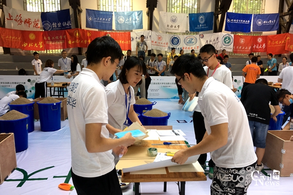 大赛组委会为参赛队员提供75cm*50cm*50cm的模型砂箱,队员通过白卡纸和牛皮纸在规定时间内完成加筋土挡墙模型制作。比赛过程中,美国CPESC和意大利注册专业工程师、马克菲尔集团土工合成材料首席专家和亚太地区技术总监Pietro Rimoldi对于我校参赛队的方案设计和施工工艺给予高度评价,并与苏谦教授和参赛队员合影留念。