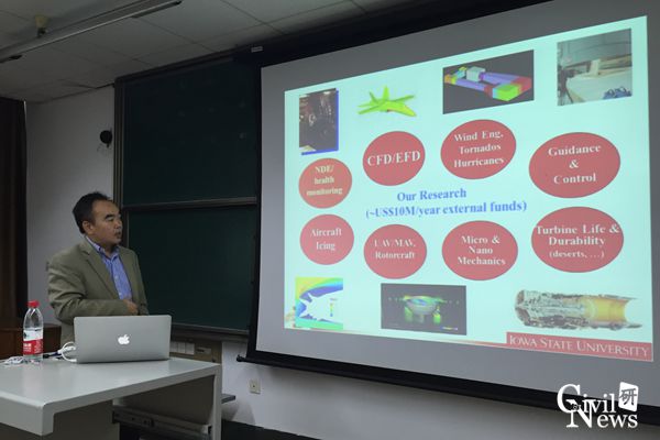 2016年12月16日,美国爱荷华州立大学航空航天工程系Martin C. Jischke冠名教授,副系主任胡晖教授和上海交通大学航空航天学院田伟博士,受桥梁工程系魏凯副教授的邀请,在我校九里校区逸夫馆4320教室作了题为“Fluid-Structure Interactions(FSI) of Built Structure in Violent Wind Storms”的“创源大讲堂”研究生学术讲座,并与太阳成官网桥梁工程系系主任李永乐教授、廖海黎教授,建筑工程系李明水教授等进行了深入交流。讲座由廖海黎教授和李明水教授共同主持。胡晖教授详细介绍了在其科研团队,采用风洞试验和基于激光的流动诊断技术在剧烈风暴(如龙卷风、下击暴流和暴风雪)的影响下流体与结构之间的相互作用关系以及风力机的结冰机理和防冰、除冰技术等领域的研究进展。胡教授通过精美的动画、震撼的视频和有趣的自然现象,帮助大家理解讲座的核心内容,赢得在座老师和同学的阵阵赞叹。随后的提问环节,胡教授回答了老师与同学所提出的种种问题,耐心细致的解答,尽显大家风范。讲座后,胡晖教授和田伟博士在廖海黎教授、魏凯副教授、杨万理副教授和秦顺全院士团队两位博士研究生的陪同下,先后来到我校犀浦校区风工程实验中心、陆地交通地质灾害防治技术国家工程实验室和在建中的深水大跨桥梁实验室进行参观交流。双方对于有关流体试验的激光诊断技术深入交换了意见,也对今后的深入合作表示欢迎和期待。