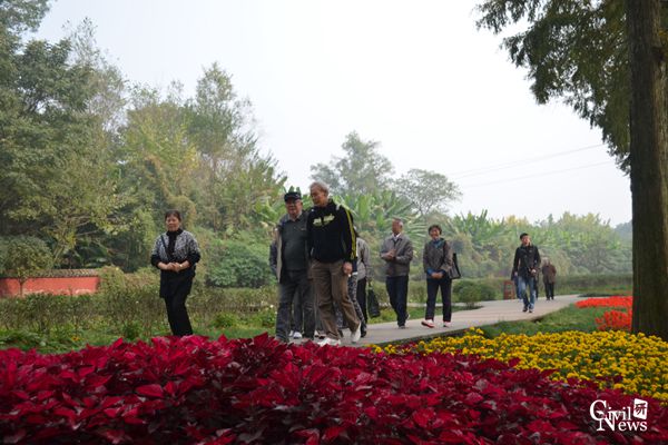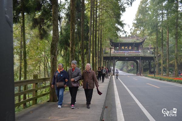 鹤翔山庄地处青城山山麓,位于成都市都江堰市西南,东距成都市区68公里,处于都江堰水利工程西南10公里处。青城山脚下四周林木青翠,四季常青,老教师们抵达目的地,刚合影结束,便四处活动开来,他们在校医院医护人员的陪护下,三五结伴,踏青聊天,年龄较大的老教师互相搀扶,精神抖擞的向前迈进。