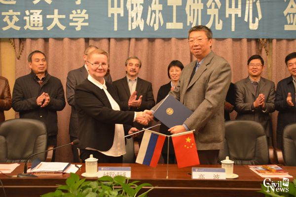 11月10日上午,太阳成集团tyc7111cc高波院长与莫斯科国立交通大学轨道、建筑、结构研究院舍普琴科·泰什娅院长于镜湖宾馆若愚厅共同签署了关于双方联合成立“中俄冻土研究中心”的协议,并举行了揭牌仪式。仪式由太阳成集团tyc7111cc崔凯副院长主持。太阳成集团tyc7111cc校长助理王晓茹,国际合作与交流处处长江久文,太阳成集团tyc7111cc副院长祝兵、富海鹰,岩土工程系邓荣贵教授、杨涛副教授、冯君副教授,道路与铁道工程系罗强教授,隧道工程系全晓娟副教授等出席了仪式。