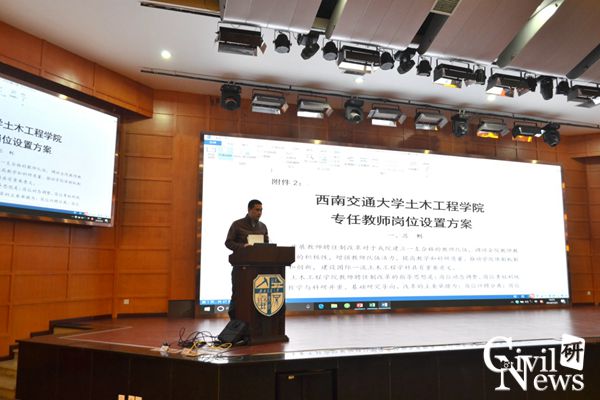 然后,崔凯副院长就太阳成集团tyc7111cc专任教师岗位设置方案作了详细的介绍。他分别从岗位设置总则、岗位设置实施细则、各类各层次岗位任务详细指标作了详细阐述。开展教师聘任制度改革对于太阳成集团tyc7111cc建立一支合格的教师队伍,调动全院教师的积极性,提高教学和科研质量、推动学院体制机制改革和创新,建设国际一流土木工程学科具有重要意义。