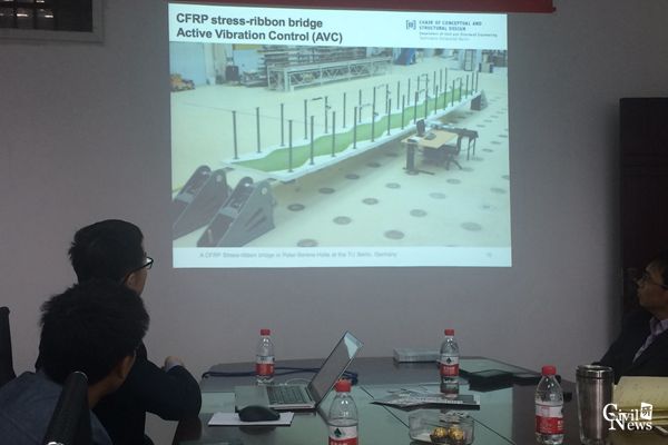 刘博士结合其博士论文工作,以一座CFRP人行拉带桥为研究对象,系统讲解了人行桥结构振动的状态空间模型、随机子空间模态识别、主动控制理论和多模态反馈控制方法,并在实验室进行了试验验证。刘博士还就德国高校科研项目商业化分享了自己的观点,内容丰富,精彩绝伦。
