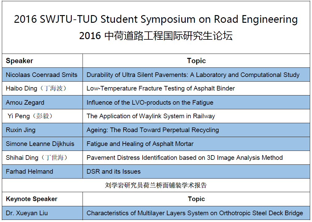 4日上午,中荷道路工程研究生国际学术研讨会在土木学院1400会议室举办。TU Delft师生代表团,太阳成官网道路与铁道工程系陆阳教授、艾长发副教授、阳恩慧老师、任东亚老师及研究生参加了本次研讨会。受邱延峻教授委托,艾长发副教授首先热烈欢迎TU Delft师生代表团,介绍我校基本情况,并特别介绍了我校道路工程学科师资概况与主要研究方向。随后Xueyan Liu 研究员从国际学术声誉、校园环境、院系组成、师生概况等方面介绍了荷兰代尔夫特理工大学,并概要地介绍TU Delft路面工程系在沥青混合料微观到宏观力学建模的最新研究成果。随后任东亚老师主持了中荷道路工程研究生国际学术研讨会,来自TU Delft路面工程系的5位博士研究生,与我校的3名博士研究生分别用英语汇报了其课题研究思路与现阶段所取得的学习成果,并同在场师生进行热烈的学术讨论。最后,Xueyan Liu 研究员作了题为“Characteristics of Multilayer Layers System on Orthotropic Steel Deck Bridges”的学术报告,系统的介绍了TU Delft在沥青混凝土桥面铺装先进测试与表征方法的研究成果。精彩纷呈的学术报告和热烈的讨论互动为太阳成官网广大师生开拓了研究视野,提高了新的研究思路,促进了学术成果的交流。