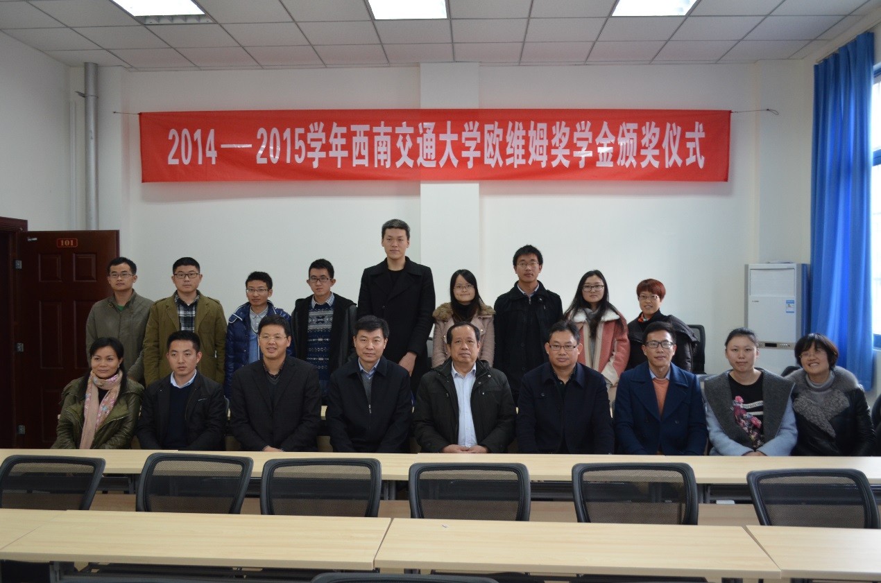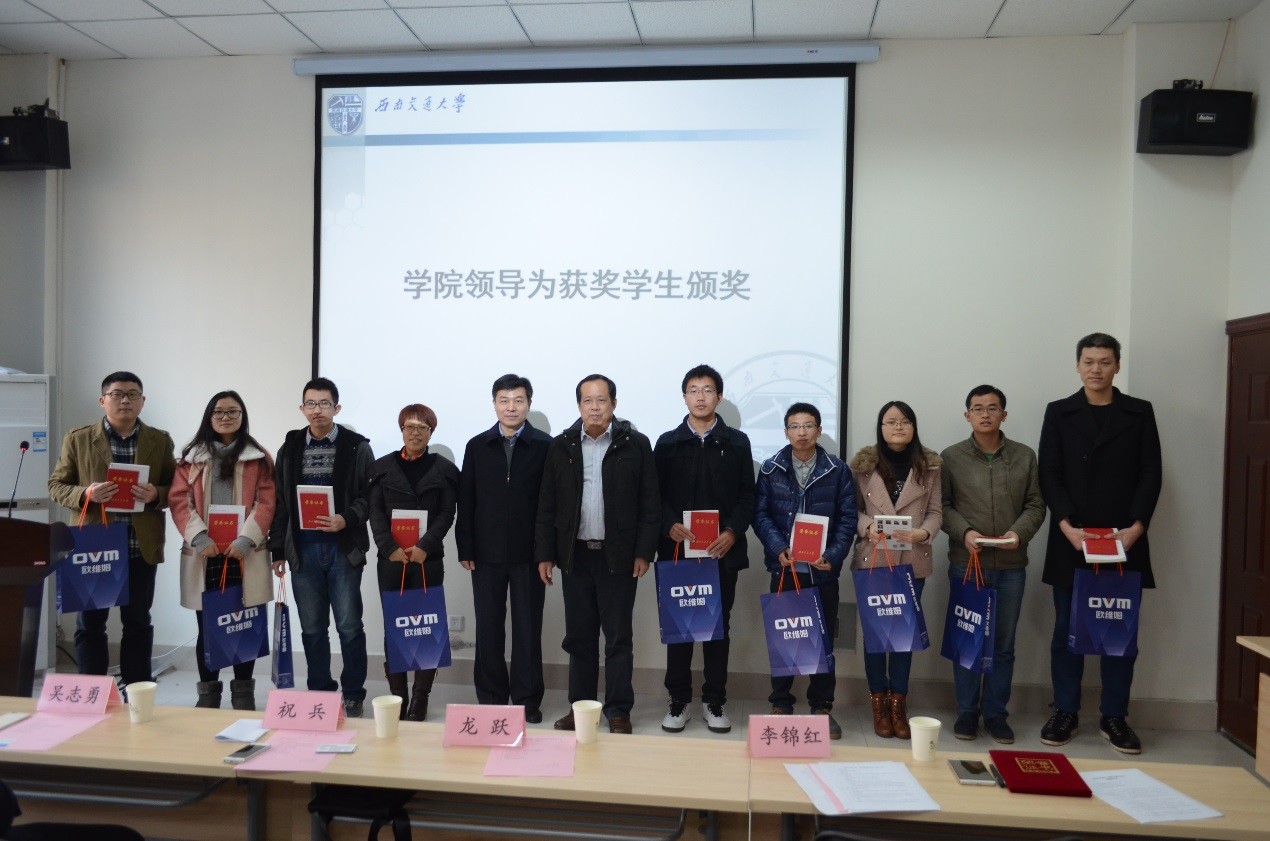 12月24日下午2点半,欧维姆奖学金颁奖仪式在九里校区隧道研发楼101室顺利举行。出席颁奖仪式的有柳州欧维姆机械股份有限公司副总经理、总工程师龙跃先生,公司技术中心副主任吴志勇先生,国内营销中心副总经理兼国内营销中心西南区域公司总经理严光林先生,太阳成集团tyc7111cc副院长祝兵教授。颁奖仪式由太阳成集团tyc7111cc党委副书记李锦红主持。同时到场的还有太阳成集团tyc7111cc辅导员老师和研究生代表。