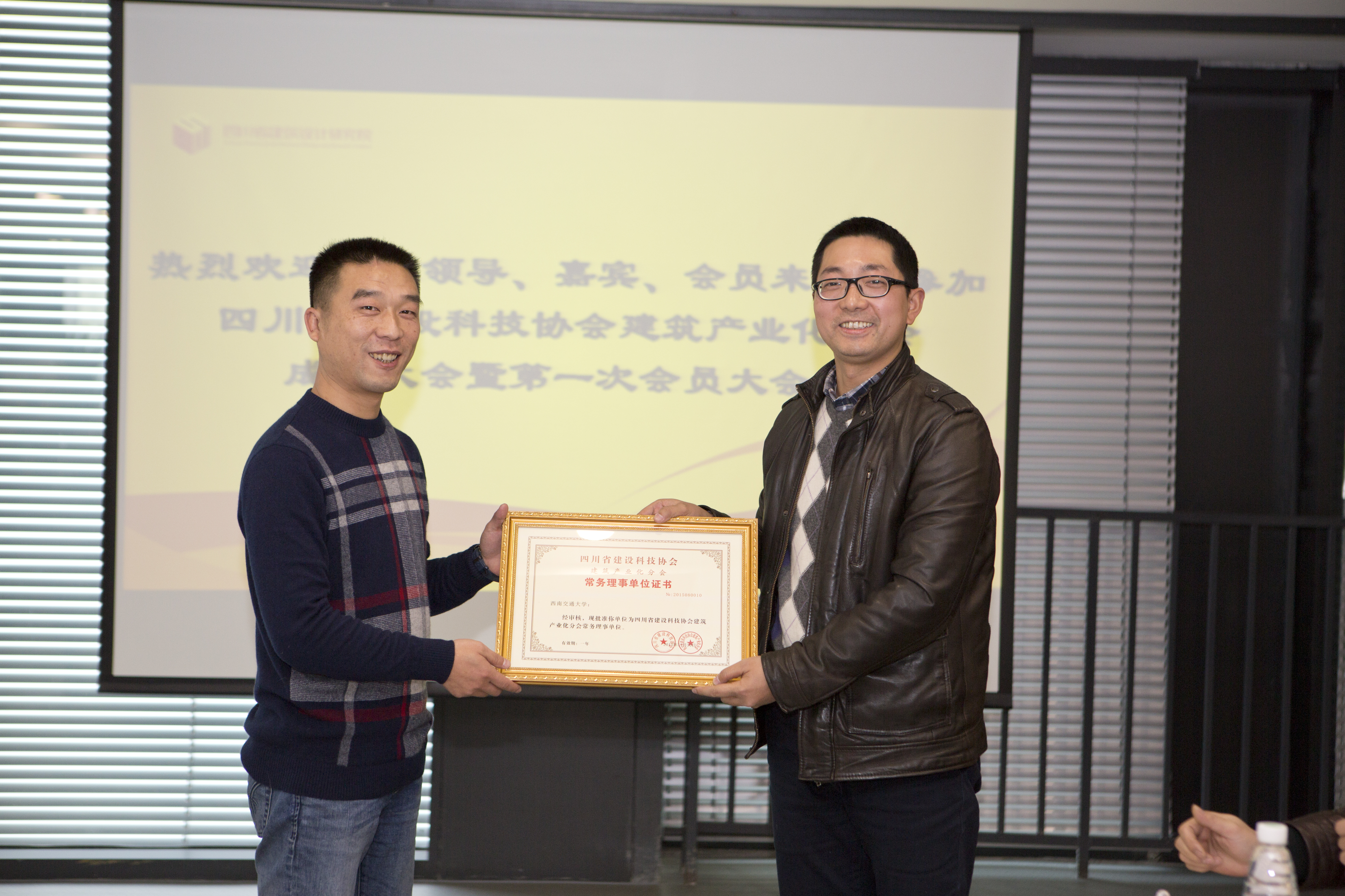 四川省建设科技协会建筑产业化分会成立大会暨第一次会员大会于2015年12月24日在成都市大源国际中心隆重举行。我校师生代表应邀参加了此次大会。会议选举产生了第一届理事会及常务理事会。太阳成集团tyc7111cc当选常务理事单位,太阳成集团tyc7111cc潘毅老师当选副会长,并获荣誉证书。我校曾晓辉、林拥军、黄群艺等老师当选会员。