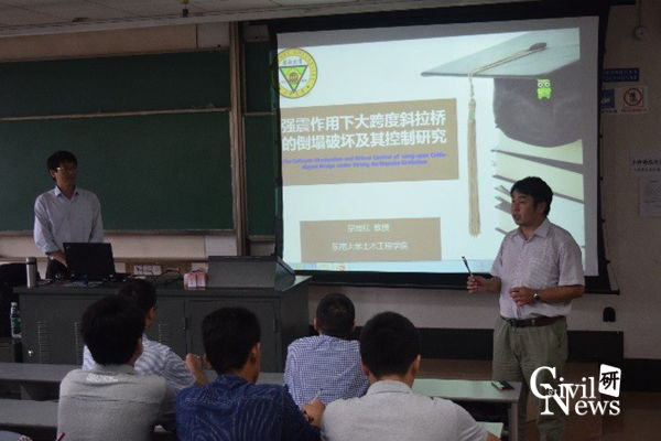 宗教授提到,面对随时可能发生的超规范水准地震作用,如何保证斜拉桥在强震后的正常使用,或者不发生倒塌以保证生命线工程的快速修复,就成为桥梁工作者们的重点攻克方向。随后他从斜拉桥模型地震模拟振动台台阵试验及其结果分析进行展开,用试验结果和数值模拟分析了非线性动力时程响应以及倒塌破坏整个过程,最后他还以灌河大桥为例,探究其倒塌模式机理,并提出相应的措施控制研究,以使得大跨度斜拉桥能够抵御随时可能出现的超规范水准地震动作用。
