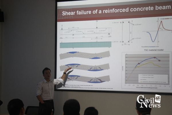 TNO DIANA中国市场营销总监Yongyeon Bae用英文介绍了DIANA在钢筋混凝土裂缝分析中的应用。Yongyeon Bae讲解了分离式裂缝(Discrete cracking)和分布式裂缝(Smeared cracking)两种混凝土开裂模型的概念、优缺点和解决办法。随后介绍了什么是嵌入式钢筋(What is Embedded Reinforcement?),DIANA在钢筋混凝土梁剪切破坏(Shear failure of a reinforcement concrete beam),剪力墙破坏(Failure of a shear wall),混凝土桥性能评估(Assessment of a concrete bridge)等中的分析运用。