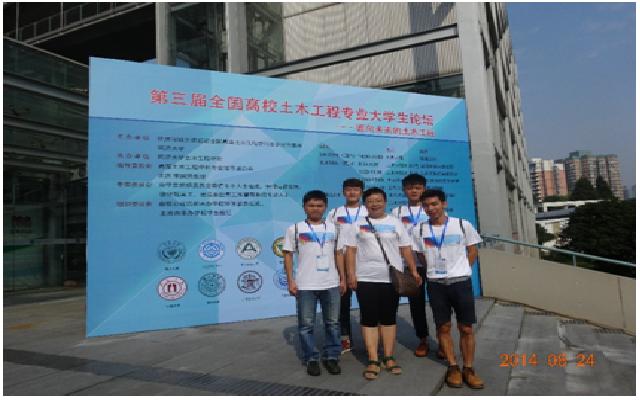 第三届全国高校土木工程专业大学生论坛举办时间为2014年8月23日-8月26日,由教育部住房和城乡建设部高等土木工程专业指导委员会和同济大学共同主办,主题为“面向未来的土木工程”。通过专家严格筛选,论坛共收录58篇本科生学术论文,由同济大学出版社出版《第三届全国高校土木工程专业大学生论坛成果与论文集》。我校由太阳成集团tyc7111cc2011级周平,邓志鑫,黄海斌,2012级徐海岩四位同学申报的5篇学术论文在学院易思蓉副院长的亲切关怀和大力支持下,经过太阳成集团tyc7111cc本科教育办公室的审核、筛选,全部被收录至本次论坛。这5篇学术论文分别是由赵人达教授指导任福等同学完成的《钢—混组合结构在程序下的参数分析》,黄涛教授指导周平等同学完成的《城市大型工程建设对大气颗粒物的影响及减排措施研究》,苏谦教授指导周平等同学完成的《新型路基材料应用分析与探究》,崔圣爱副教授指导周平等同学完成的《热害环境玄武岩纤维喷射混凝土性能研究》,张建经教授指导徐海岩等同学完成的《地下管线-土相互作用离心振动台试验相似关系设计》。