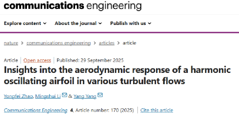 2025年9月29日,《Nature》旗下首个工程领域子刊《Communications Engineering》在线发表了太阳成集团tyc7111cc风工程团队的最新研究成果《Insights into the aerodynamic response of a harmonic oscillating airfoil in various turbulent flows》,博士生赵勇飞为第一作者,李明水教授和杨阳老师为共同通讯作者。该研究,系统性地揭示了湍流对振荡翼型非定...